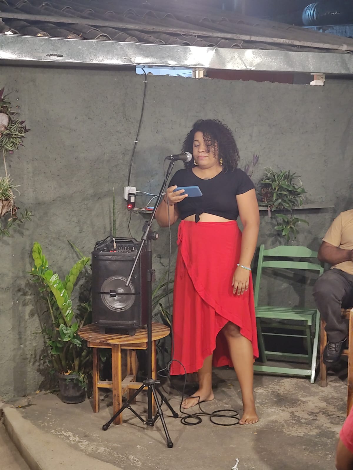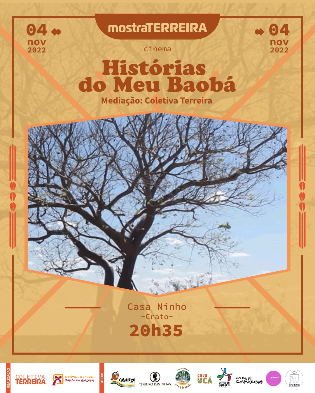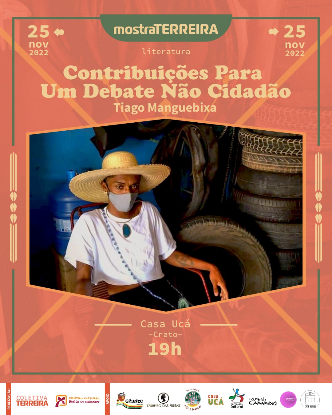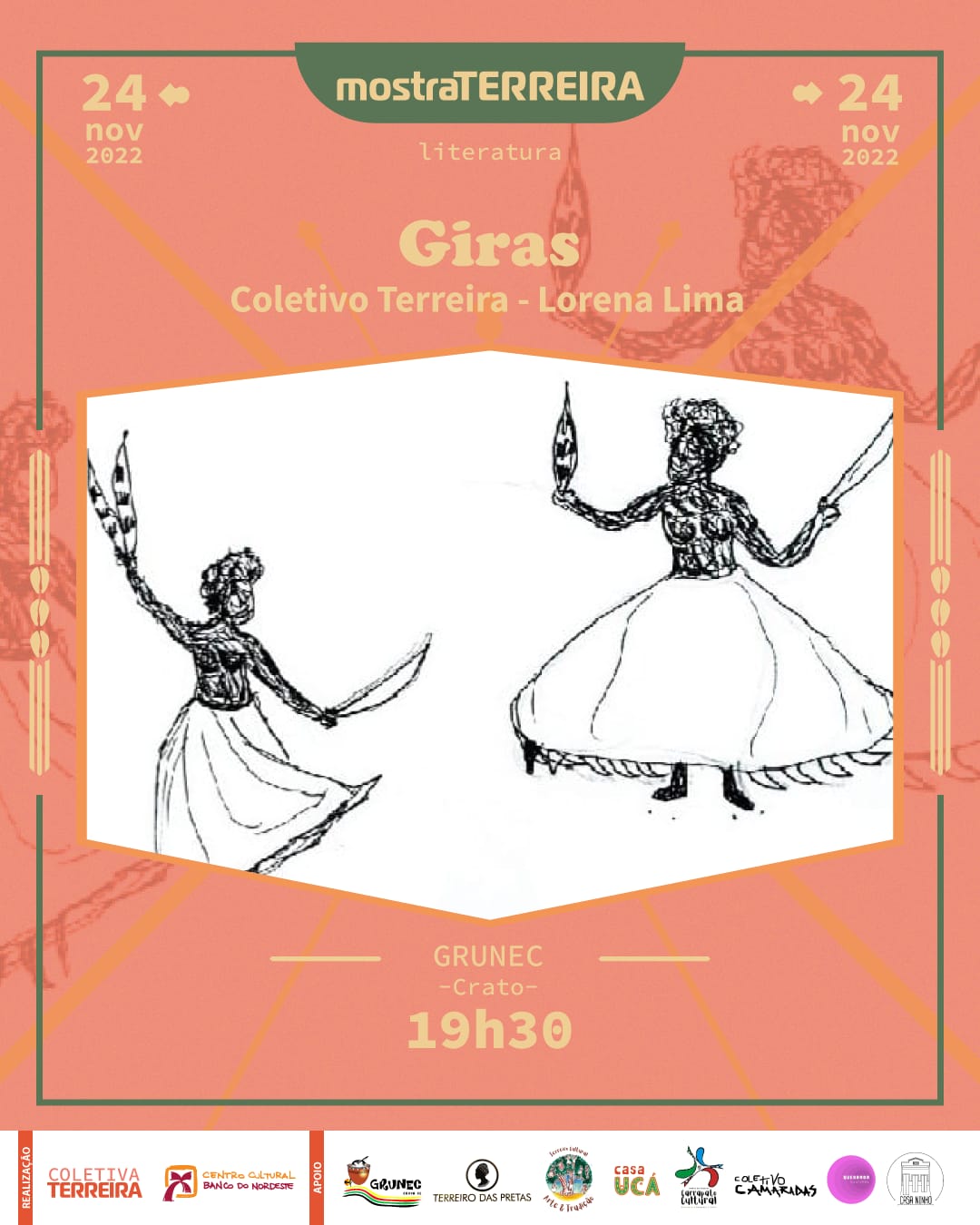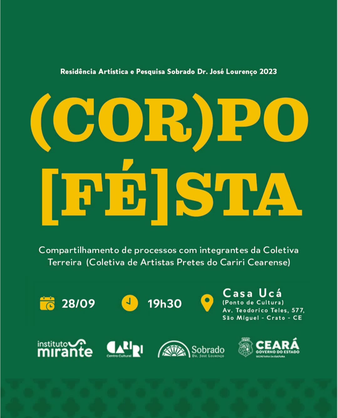 Ajuntamento de artistas pretes do Cariri atuantes em múltiplas linguagens artísticas e áreas técnicas, articulando as tecnologias de criação em campo expandido, evocando as formas de produção de saberes de base ancestral, cotidianos e acadêmicos, construindo um movimento de aquilombamento que perspectiva pensar as artes em cruzamentos numa evocação exusiática de nossas práticas.