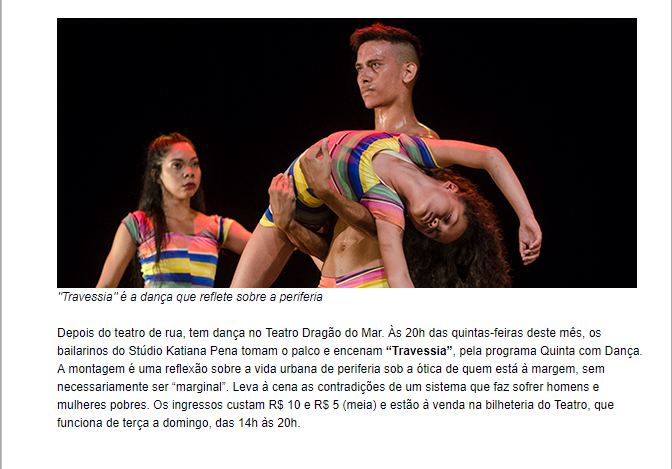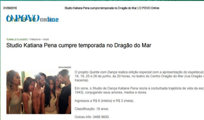 O Instituto Katiana Pena – IKP é uma associação de direito privado, beneficente, com fins não econômicos. Trabalhamos no atendimento e defesa dos direitos das crianças, adolescentes, jovens e de seus familiares, utilizando a arte e a educação, sobretudo, a dança, como estratégia pedagógica, para o desenvolvimento humano e a proteção dos seus direitos. Nossas atividades são: Aulas de dança clássica e contemporânea e, aulas de capoeira, para criança, adolescentes e jovens; Atividades de incentivo à leitura, aulas de inglês, contação de histórias, cineclube, artes e pinturas e ilha digital. A carga horária do IKP é bem extensa: são 20 turmas de dança semanais; às segundas, quartas e sextas-feiras, são 3 turmas pela manhã, 4 na parte da tarde e 3 à noite. E nas terças e quintas-feiras, são 3 turmas pela manhã e 4 à tarde, na parte da noite, são três turmas, uma de Balé para crianças, o Corpo Ginga, aulas de Capoeira e o CorpoMudança. O IKP desenvolve aulas de balé clássico, contemporâneo e jazz. Além da formação em dança a instituição desenvolve o projeto – Dança Compartilhada, onde artistas da área da dança de Fortaleza compartilharam suas experiências com o corpo de baile “CorpoMudança” e com educandos que para aprofundar seus conhecimentos em dança. Além das atividades de formação em dança, o IKP proporciona ainda atividades complementares de incentivo a leitura, acompanhamento escolar, grupo de fortalecimento de vínculos, capoeira, karatê, esporte, desenho e pintura, cineclube e contação de histórias. O CorpoMudança do IKP, formado por jovens do grande Bom Jardim, realiza anualmente, pesquisas, estudos e montagens de espetáculos com temas relacionados a realidade vivida na periferia. No final do ano, o IKP realiza o festival de dança “Corpopotencia”, com a mostra dos resultados do trabalho desenvolvido com os educandos, possibilitando-os o primeiro contato com palco, o acesso a arte e a cultura.Vídeos