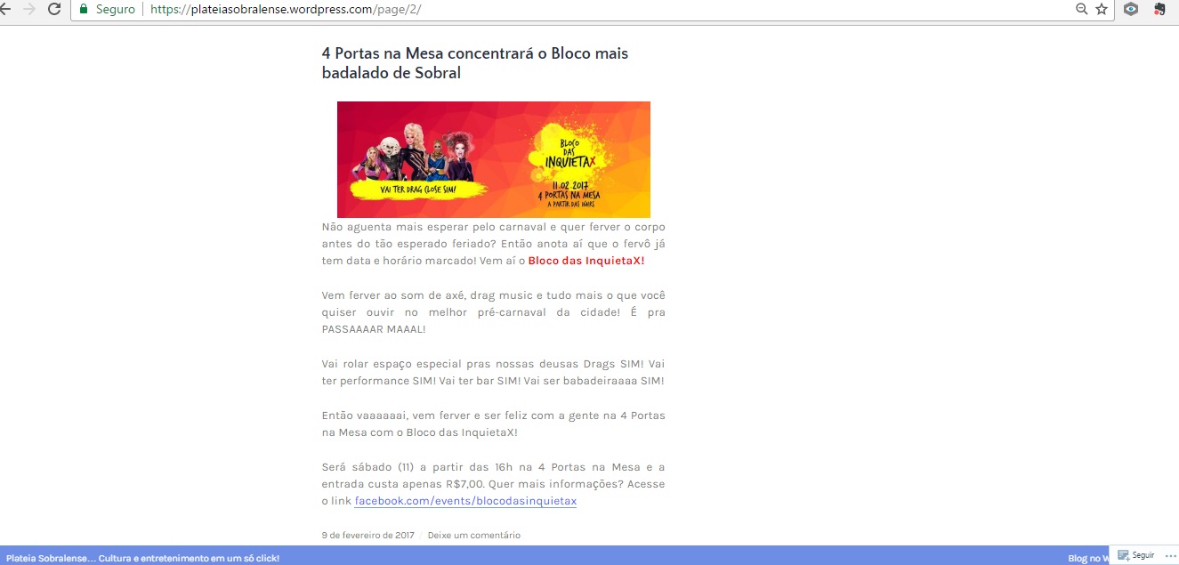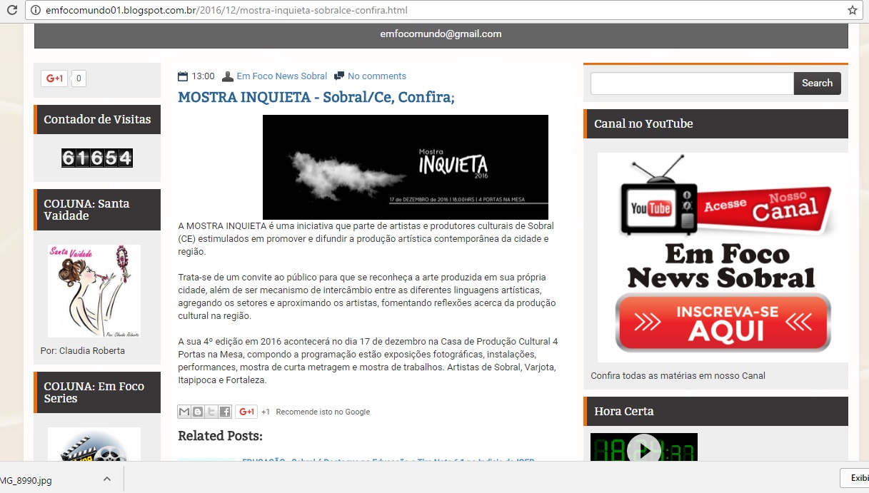 Mostra Inquieta de Artes Integrada foi produzida em 2025 pela Cia. Nós de Dança, realizada em 05 espaços culturais independentes de Sobral, a saber: Biblioteca Comunitária Adalberto Mendes, Casa dos Corres, 4Portas Nambu, Casulo Casa Cultural e 4Portas Margem.A programação foi composta por 02 espetáculos de teatro, 02 performance artísticas, 02 esquetes de dança, 03 exibição audiovisual (doc, curta e videoarte) e 01 show musical.